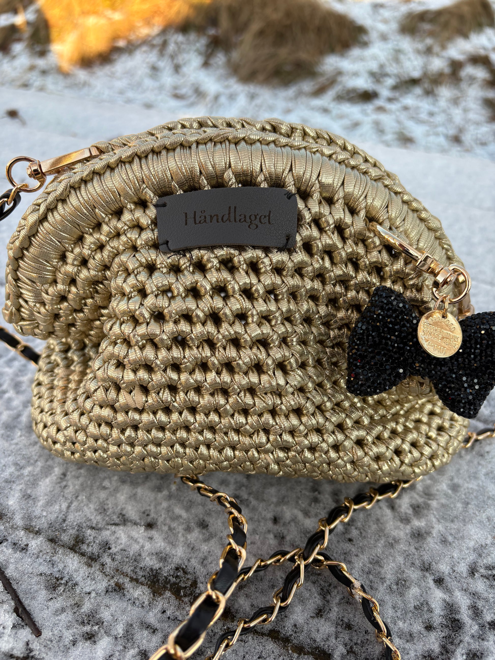 Denne heklede vesken er håndlaget i luksuriøst tekstilgarn i champagne-gull. Den kombinerer nordisk enkelhet med lekne detaljer som får deg til å smile.
