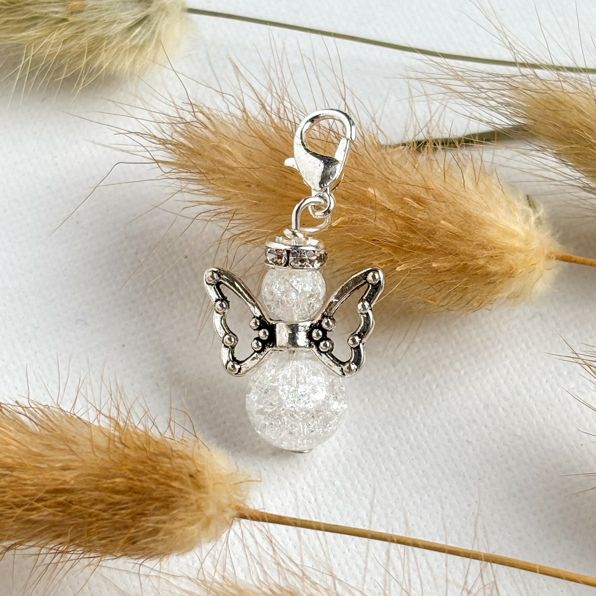 En av våre mest populære engler! May er sølvfarget med hvite krakkelerte perler til kropp og hode.