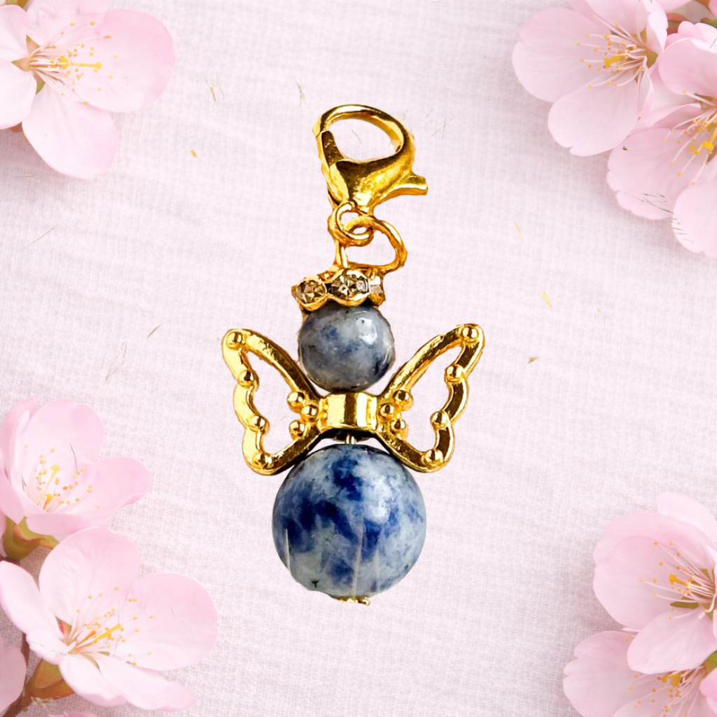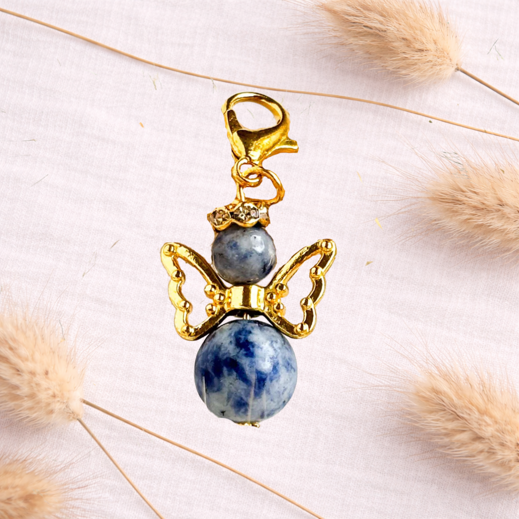 Jeg liker at hun føles stødig. Gullvingene gir varme, mens de blå perlene gir balanse. Sammen blir det en fin kontrast – mykt og sterkt på samme tid.