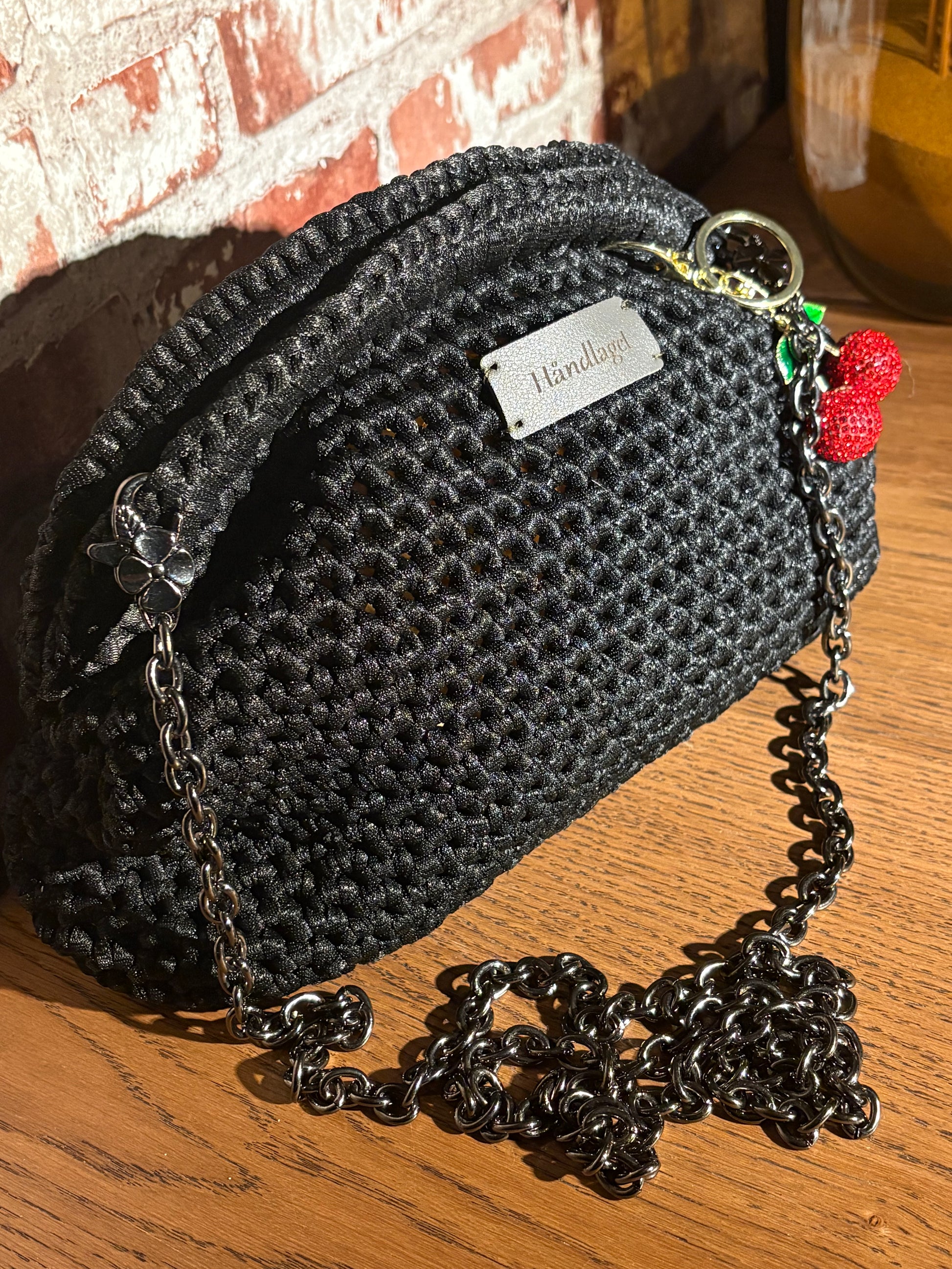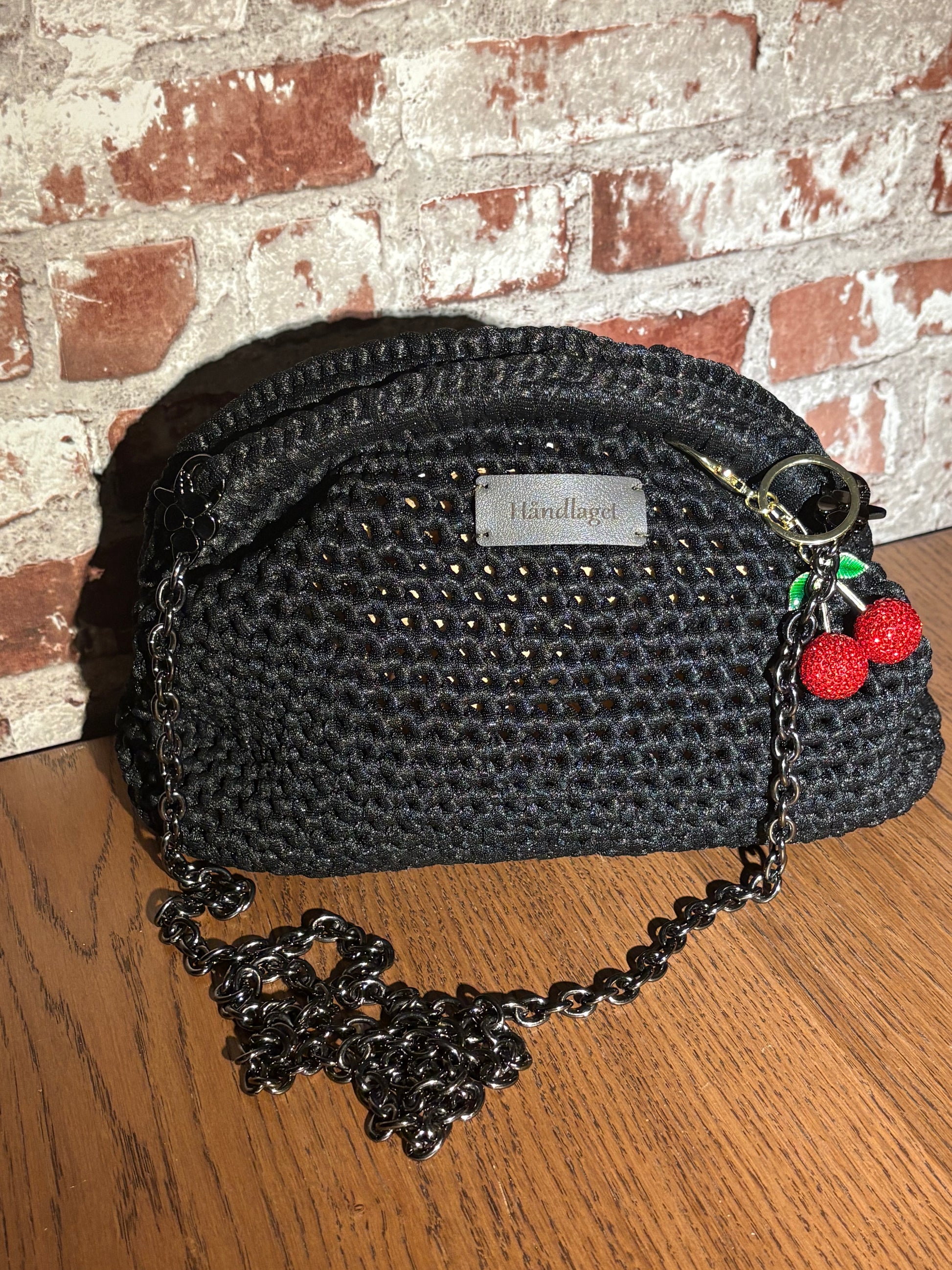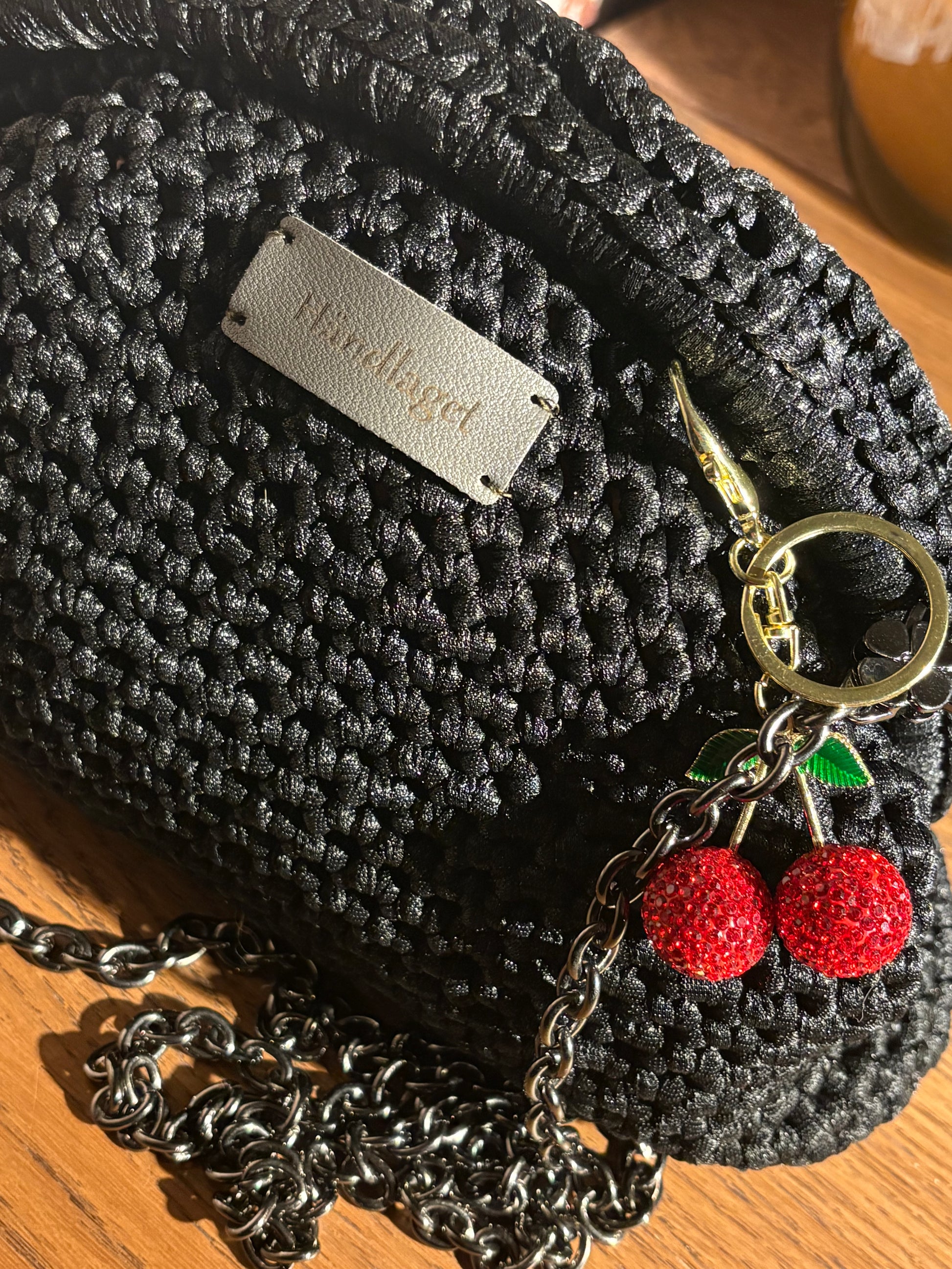 Denne vesken er litt som en liten hemmelighet du alltid kan ta med deg ut. Den dype, svarte fargen og den blanke metallkjeden gir et hint av mystikk – og så dukker de søteste røde kirsebærene opp og bryter alt med et smil. Heklet for hånd med masse kjærlighet, og perfekt når du vil ha et lite blikkfang uten å rope høyt. Den svelger mobilen, leppepomaden og alt det små som må være med – resten gjør du selv med stilen din.