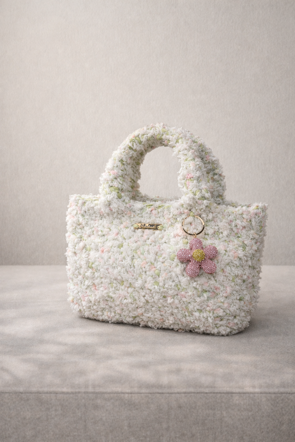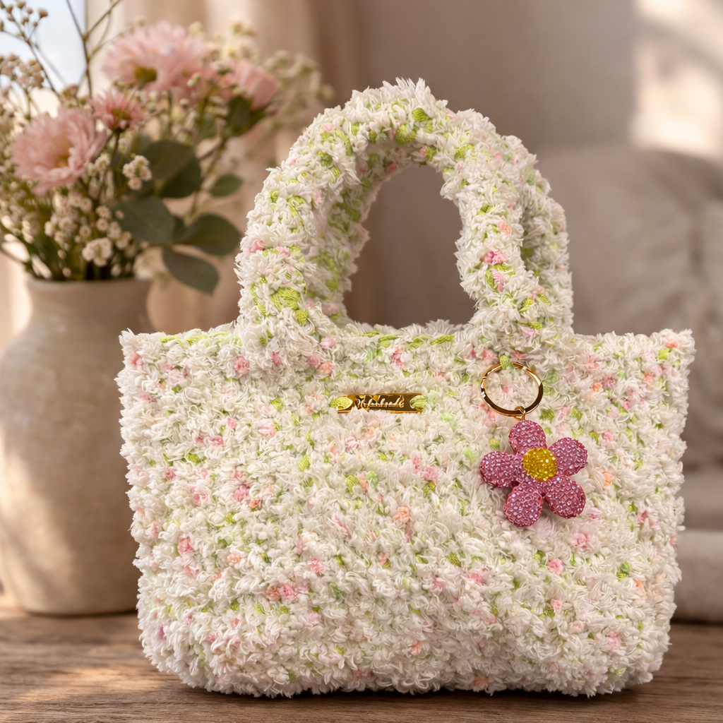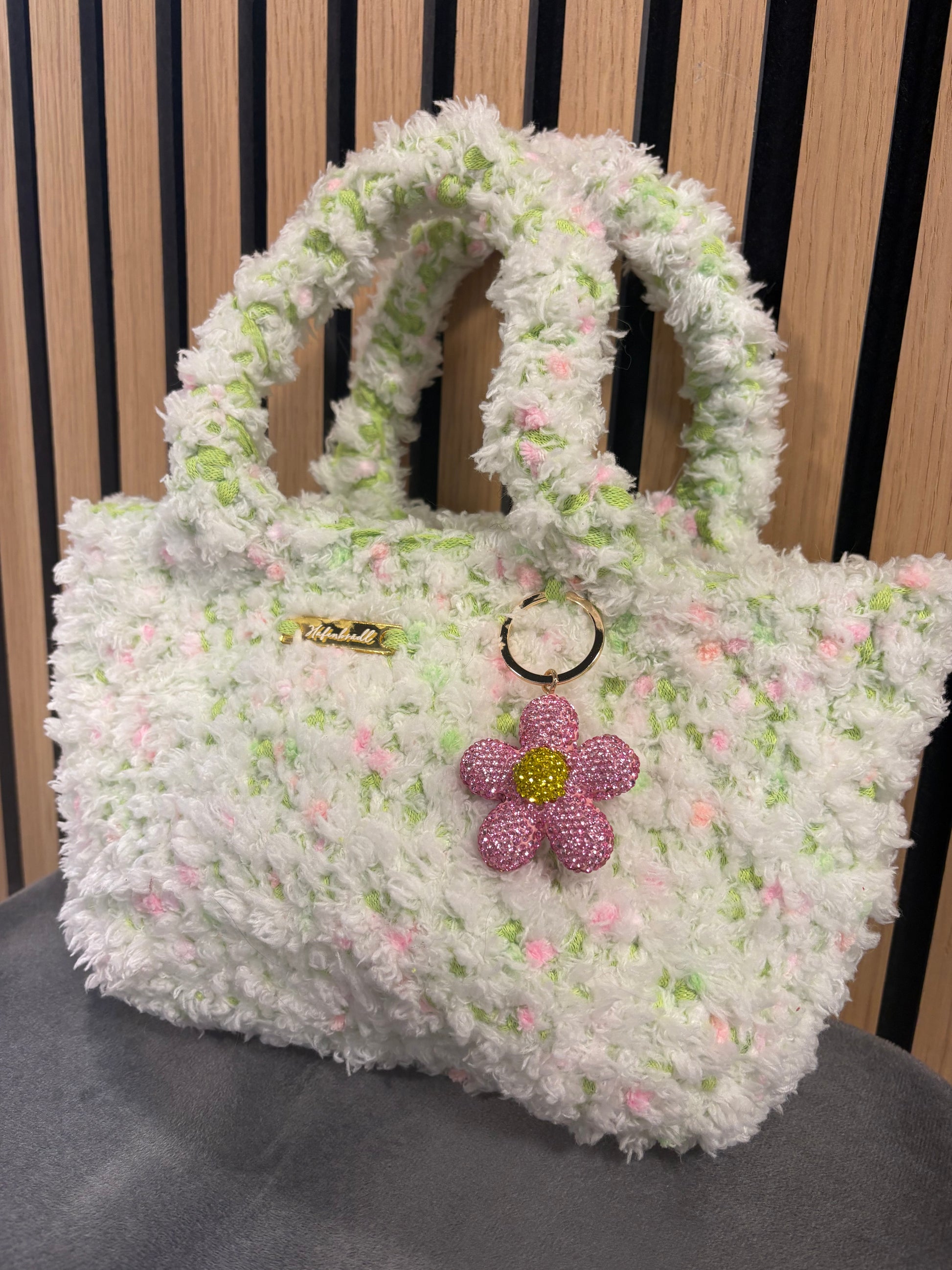 Denne vesken er håndlaget med et mykt og levende garn som gir den et lett og nesten blomstrende uttrykk. Den lyse basen med små innslag av grønt og rosa gjør at den føles frisk og våraktig, samtidig som den fortsatt er rolig og enkel å bruke til mange antrekk.