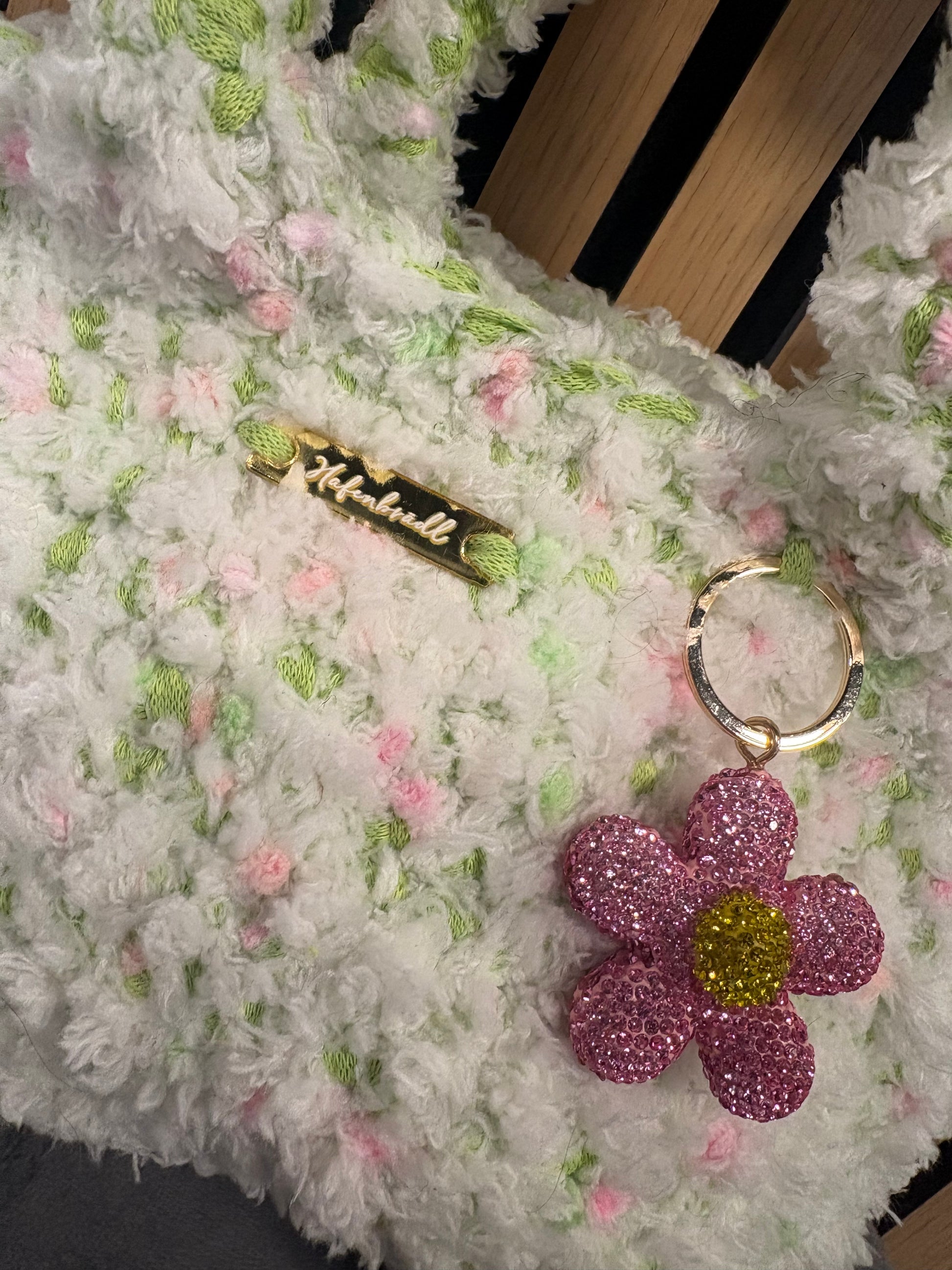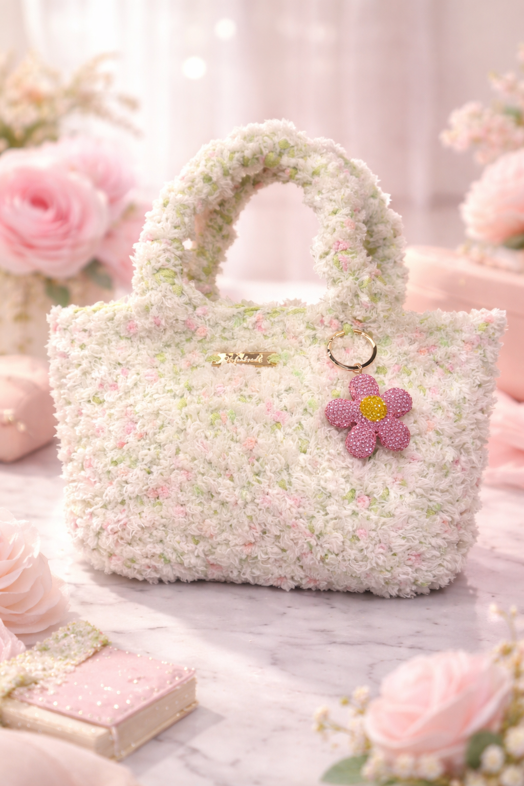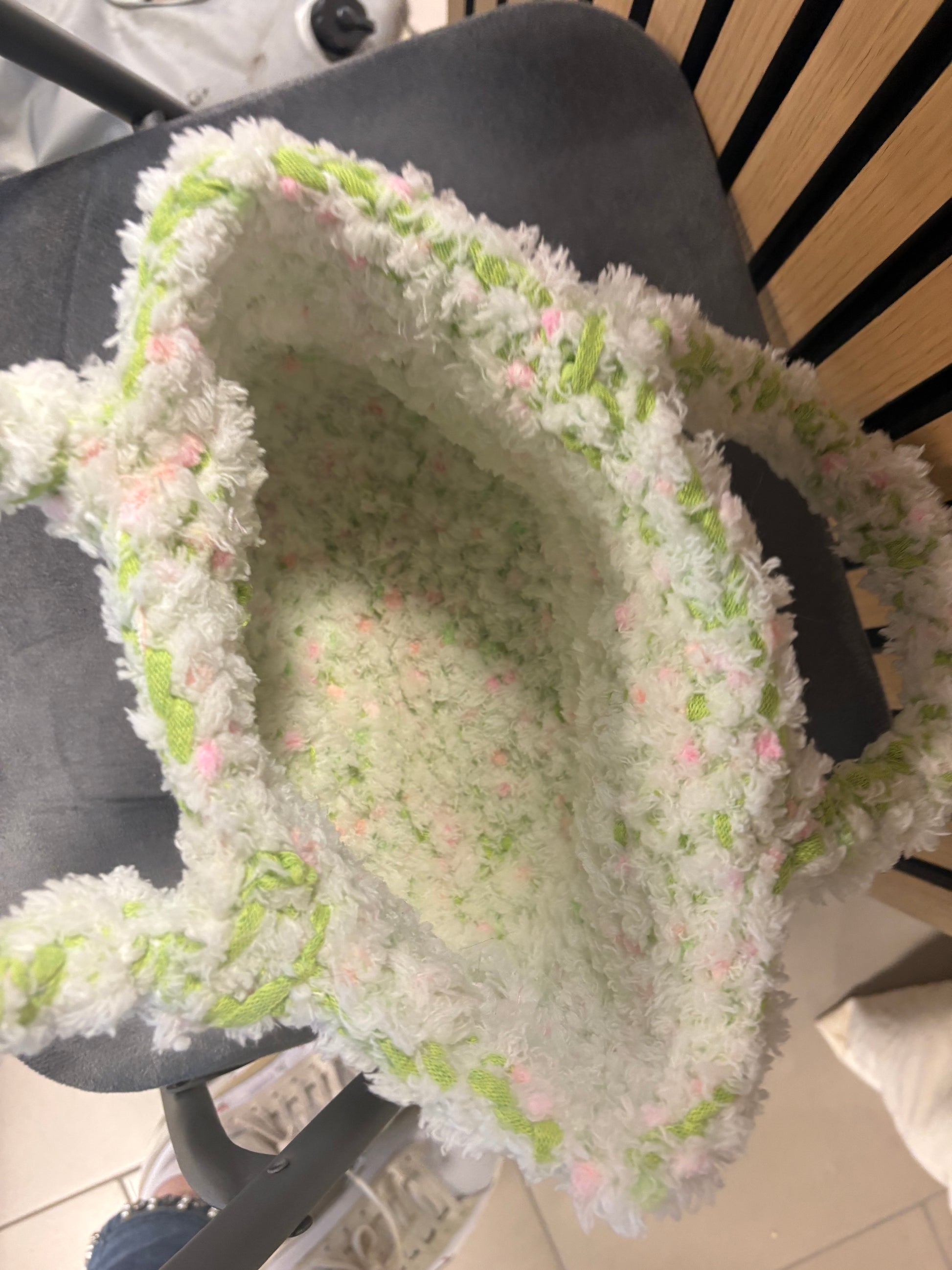 Denne vesken er håndlaget med et mykt og levende garn som gir den et lett og nesten blomstrende uttrykk. Den lyse basen med små innslag av grønt og rosa gjør at den føles frisk og våraktig, samtidig som den fortsatt er rolig og enkel å bruke til mange antrekk.